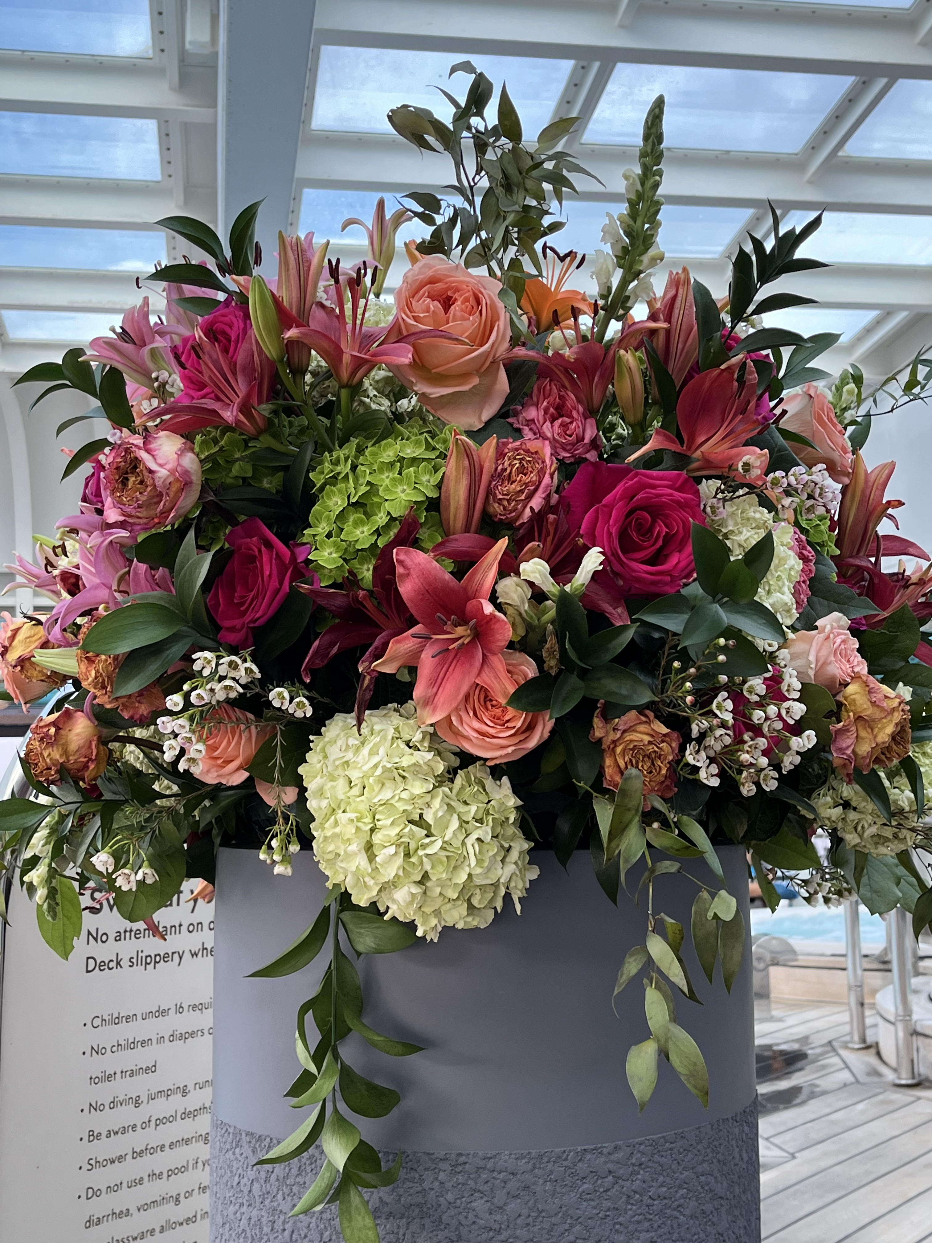 This is still a work in progress but we have over 100 days left to get the rhythm right! Playing Pickleball is the clear priority, which means finding the right time to play with the right people. With the wind, the rocking ship, and the high temperatures, we can’t play as long as we do with our Pickleball friends in Paducah, but we’re starting to figure it out. So far, playing in the morning after breakfast but before Pickleball instruction begins seems like it might work. But afternoon Pickleball has been fun, too. We’re meeting some nice people who happen to also play pretty good Pickleball. We haven’t yet figured out the pool or whirlpools, but we will (or we won’t and who cares, really?). Meanwhile, we are only using the stairs so we do get a bit of exercise besides time on the court.